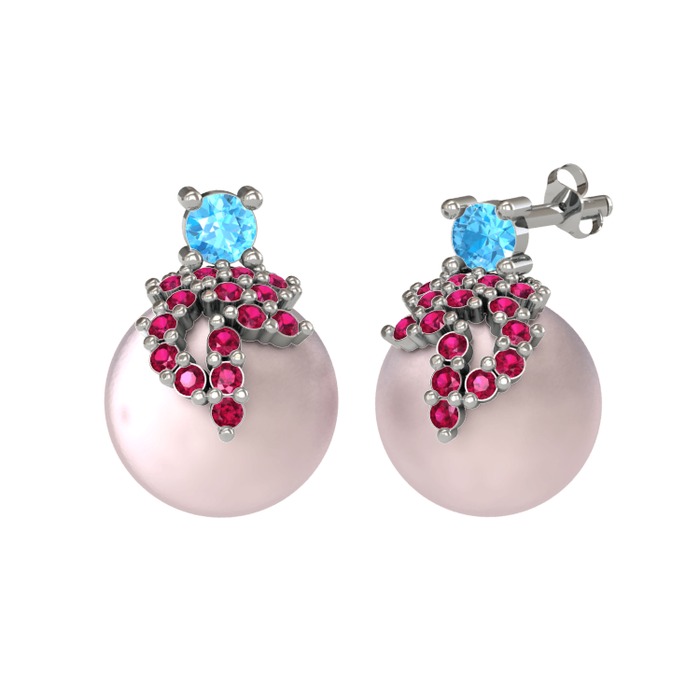 Akuamarin, rodolit garnet ve pembe inci 14 ayar beyaz altın küpe