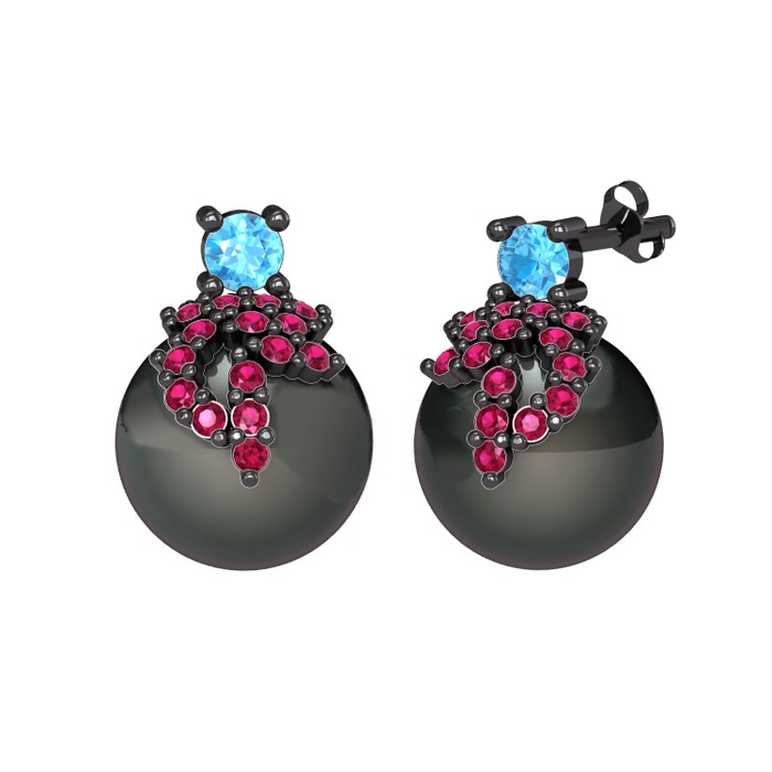 Akuamarin, rodolit garnet ve siyah inci 925 ayar siyah rodyum kaplama gümüş küpe