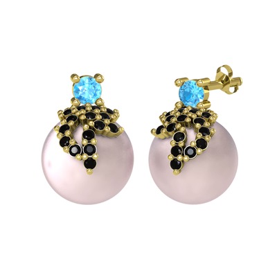 Akuamarin, siyah zirkon ve pembe inci 8 ayar altın küpe
