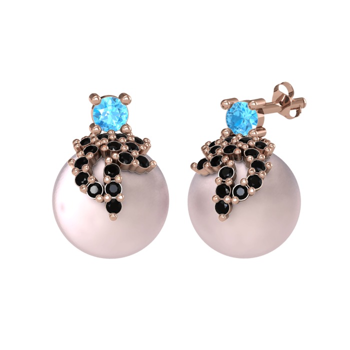 Akuamarin, siyah zirkon ve pembe inci 8 ayar rose altın küpe