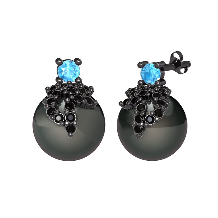 Akuamarin, siyah zirkon ve siyah inci 925 ayar siyah rodyum kaplama gümüş küpe