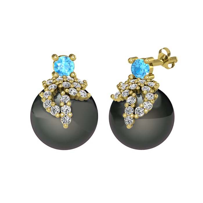 Akuamarin, swarovski ve siyah inci 925 ayar altın kaplama gümüş küpe