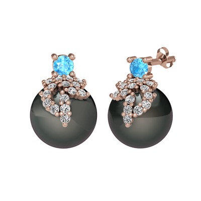 Akuamarin, swarovski ve siyah inci 925 ayar rose altın kaplama gümüş küpe