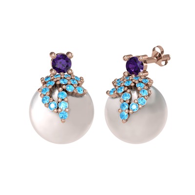 Ametist, akuamarin ve inci 18 ayar rose altın küpe