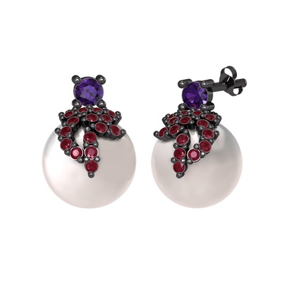 Ametist, kök yakut ve inci 925 ayar siyah rodyum kaplama gümüş küpe