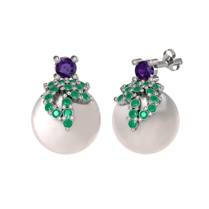 Ametist, kök zümrüt ve inci 14 ayar beyaz altın küpe