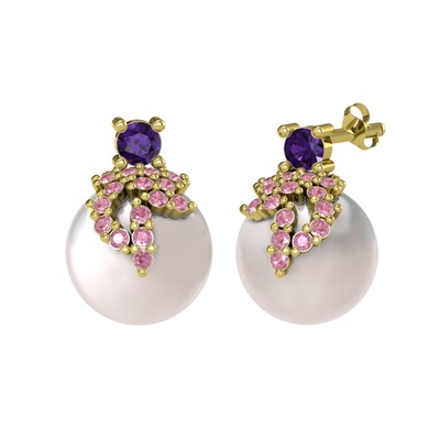 Ametist, pembe kuvars ve inci 14 ayar altın küpe