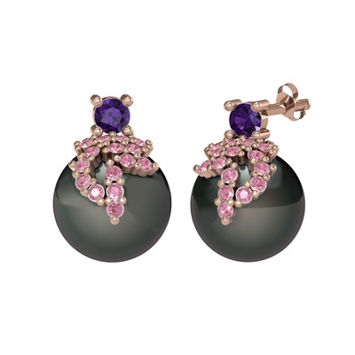 Ametist, pembe kuvars ve siyah inci 925 ayar rose altın kaplama gümüş küpe