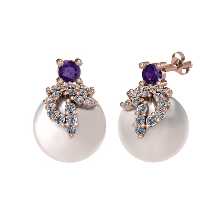 Ametist, pırlanta ve inci 14 ayar rose altın küpe (0.352 karat)