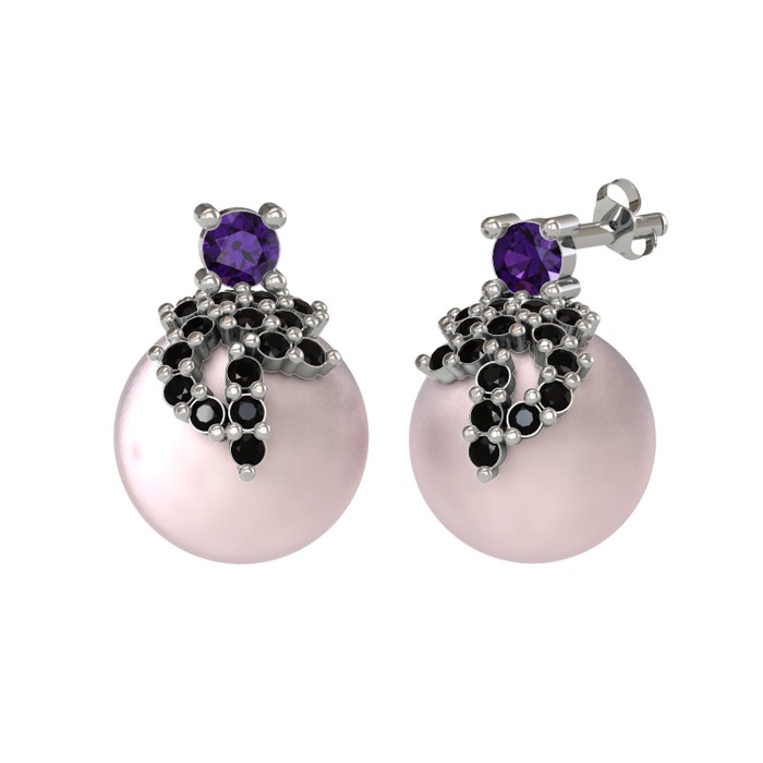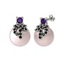 Ametist, siyah zirkon ve pembe inci 18 ayar beyaz altın küpe