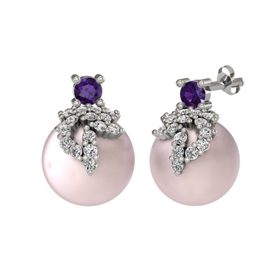 Ametist, swarovski ve pembe inci 18 ayar beyaz altın küpe