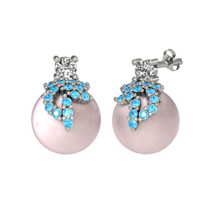 Beyaz zirkon, akuamarin ve pembe inci 18 ayar beyaz altın küpe