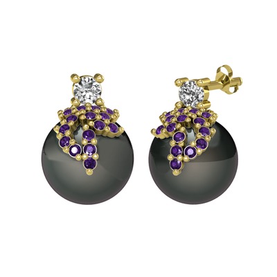 Beyaz zirkon, ametist ve siyah inci 18 ayar altın küpe