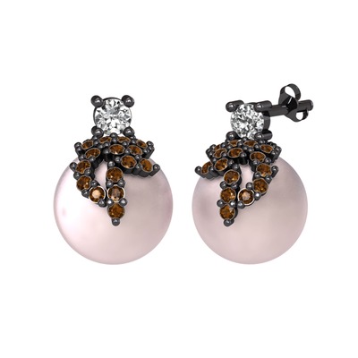 Beyaz zirkon, dumanlı kuvars ve pembe inci 925 ayar siyah rodyum kaplama gümüş küpe