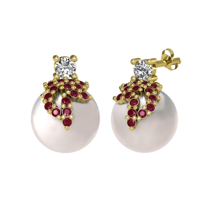 Beyaz zirkon, kök yakut ve inci 18 ayar altın küpe