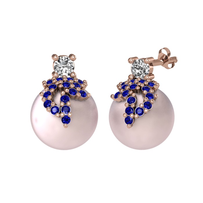 Beyaz zirkon, lab safir ve pembe inci 14 ayar rose altın küpe