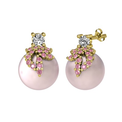 Beyaz zirkon, pembe kuvars ve pembe inci 8 ayar altın küpe