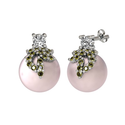 Beyaz zirkon, peridot ve pembe inci 8 ayar beyaz altın küpe