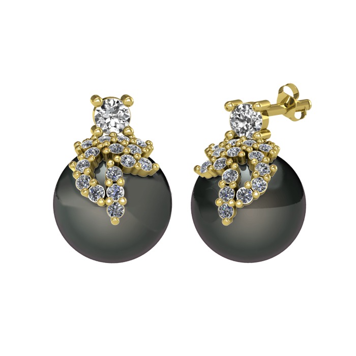 Beyaz zirkon, pırlanta ve siyah inci 8 ayar altın küpe (0.352 karat)