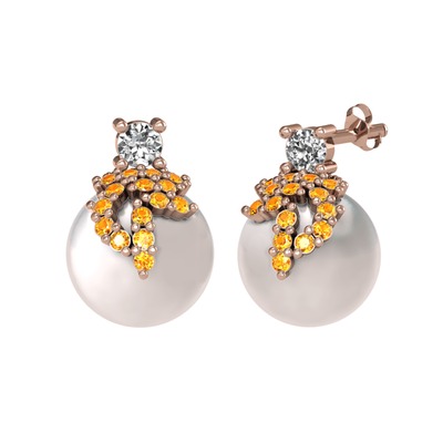 Beyaz zirkon, sitrin ve inci 8 ayar rose altın küpe