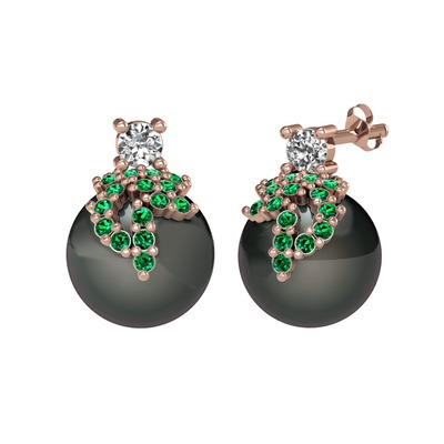 Beyaz zirkon, yeşil kuvars ve siyah inci 8 ayar rose altın küpe