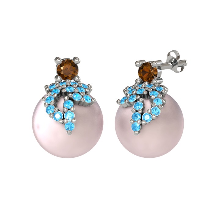 Dumanlı kuvars, akuamarin ve pembe inci 18 ayar beyaz altın küpe