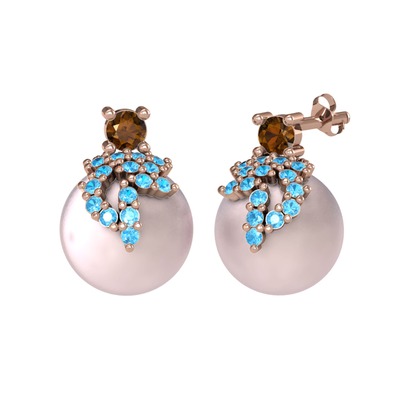 Dumanlı kuvars, akuamarin ve pembe inci 8 ayar rose altın küpe