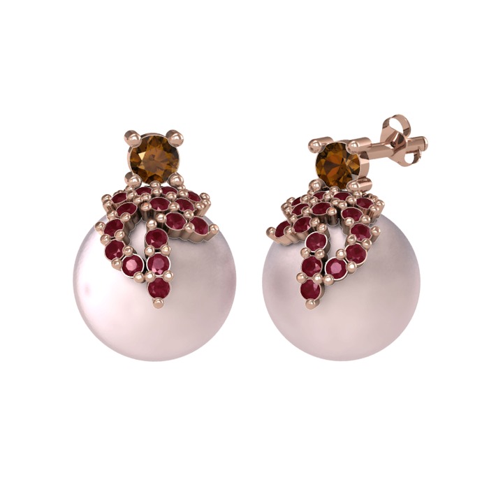 Dumanlı kuvars, kök yakut ve pembe inci 14 ayar rose altın küpe
