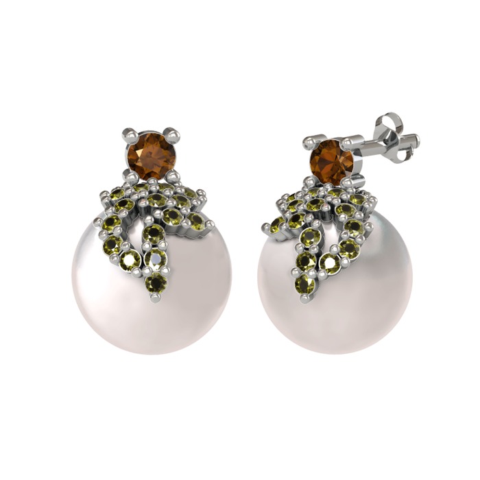 Dumanlı kuvars, peridot ve inci 8 ayar beyaz altın küpe