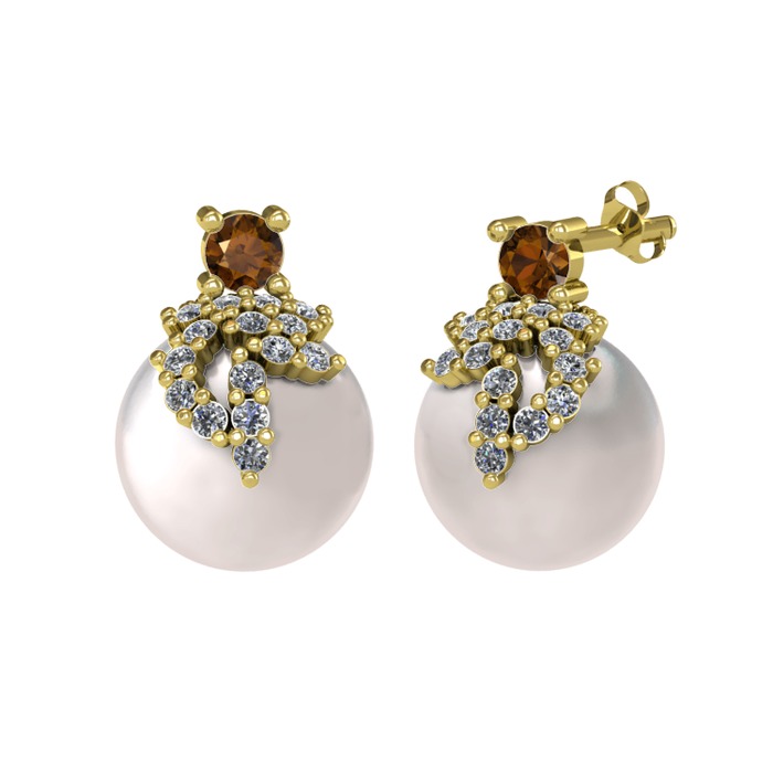 Dumanlı kuvars, pırlanta ve inci 14 ayar altın küpe (0.352 karat)