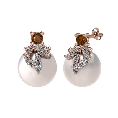Dumanlı kuvars, pırlanta ve inci 18 ayar rose altın küpe (0.352 karat)