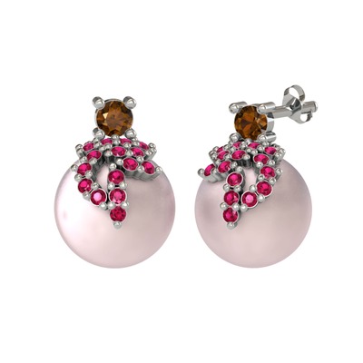 Dumanlı kuvars, rodolit garnet ve pembe inci 14 ayar beyaz altın küpe