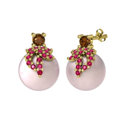 Dumanlı kuvars, rodolit garnet ve pembe inci 8 ayar altın küpe