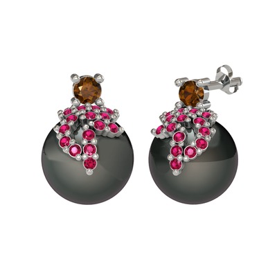 Dumanlı kuvars, rodolit garnet ve siyah inci 925 ayar gümüş küpe
