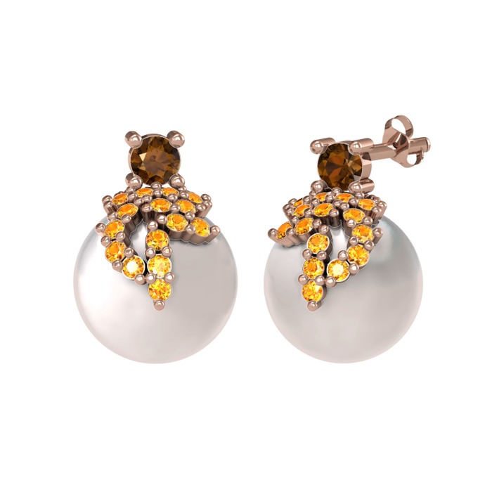 Dumanlı kuvars, sitrin ve inci 8 ayar rose altın küpe