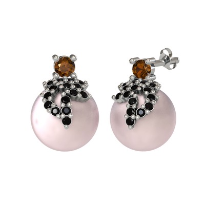 Dumanlı kuvars, siyah zirkon ve pembe inci 14 ayar beyaz altın küpe
