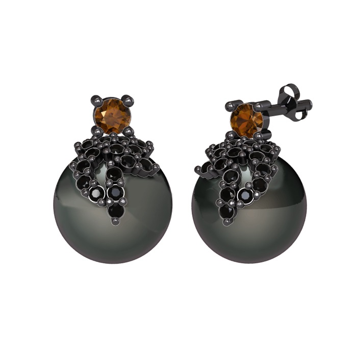 Dumanlı kuvars, siyah zirkon ve siyah inci 925 ayar siyah rodyum kaplama gümüş küpe