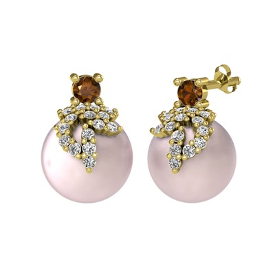 Dumanlı kuvars, swarovski ve pembe inci 14 ayar altın küpe