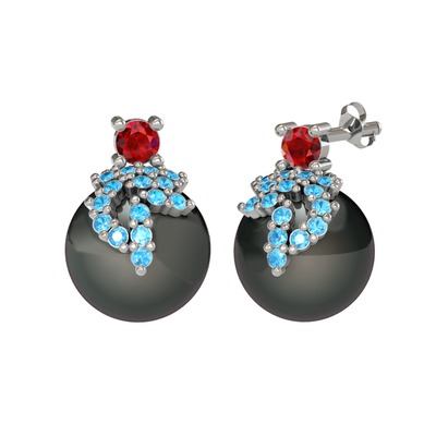 Garnet, akuamarin ve siyah inci 18 ayar beyaz altın küpe