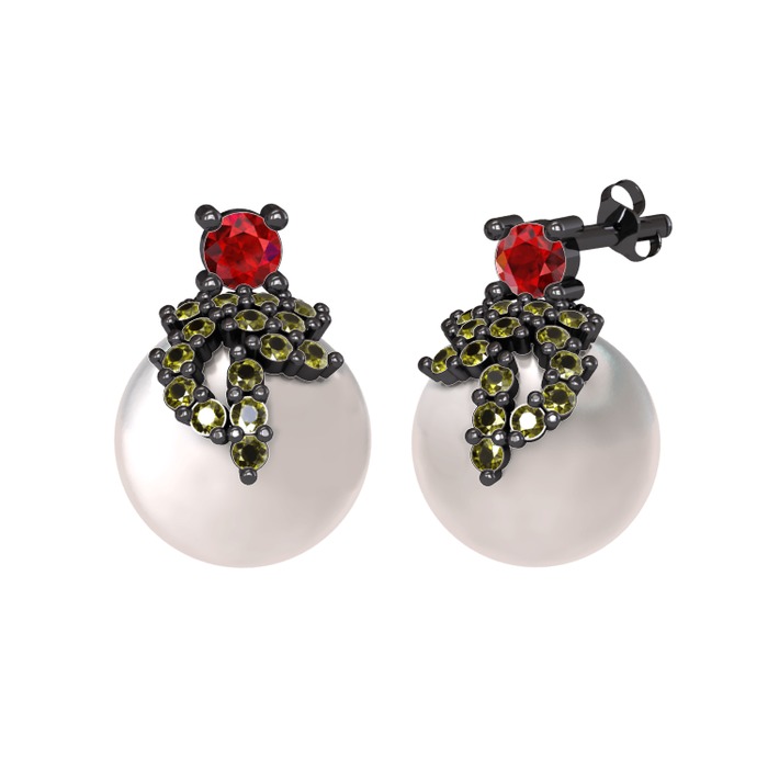 Garnet, peridot ve inci 925 ayar siyah rodyum kaplama gümüş küpe