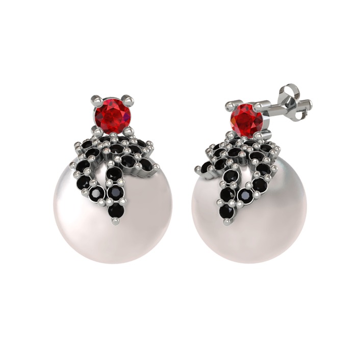 Garnet, siyah zirkon ve inci 14 ayar beyaz altın küpe