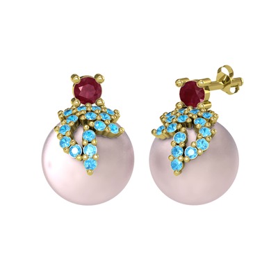 Kök yakut, akuamarin ve pembe inci 8 ayar altın küpe