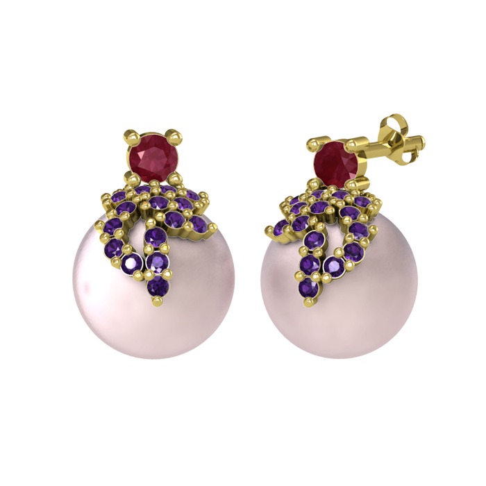 Kök yakut, ametist ve pembe inci 8 ayar altın küpe
