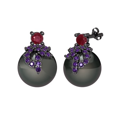 Kök yakut, ametist ve siyah inci 925 ayar siyah rodyum kaplama gümüş küpe