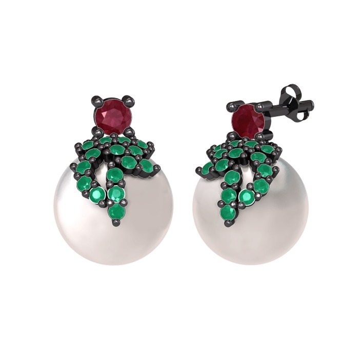 Kök yakut, kök zümrüt ve inci 925 ayar siyah rodyum kaplama gümüş küpe