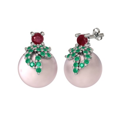 Kök yakut, kök zümrüt ve pembe inci 14 ayar beyaz altın küpe
