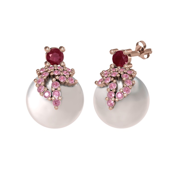 Kök yakut, pembe kuvars ve inci 8 ayar rose altın küpe