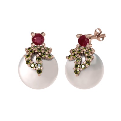 Kök yakut, peridot ve inci 18 ayar rose altın küpe