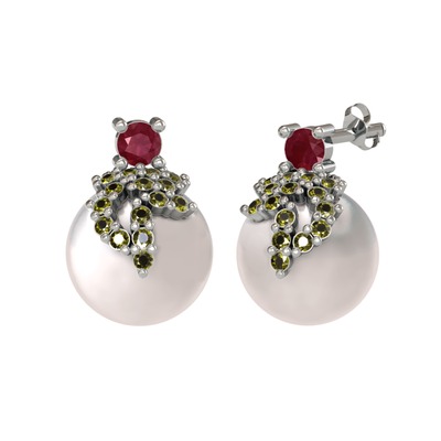 Kök yakut, peridot ve inci 925 ayar gümüş küpe