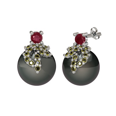 Kök yakut, peridot ve siyah inci 14 ayar beyaz altın küpe